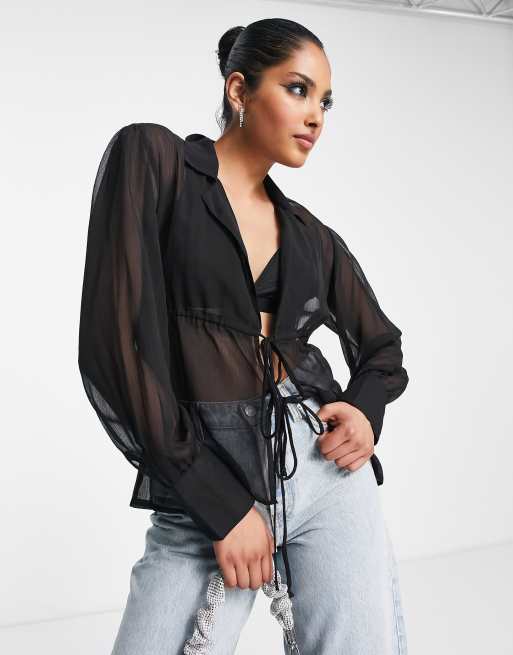 Extro & Vert - Sort bluse med bindebånd foran i gennemsigtig chiffon