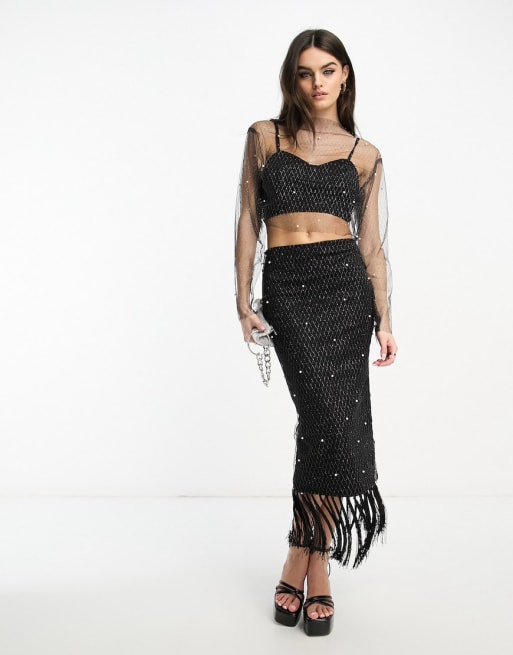 Extro & Vert - Sort sæt med croptop og midinederdel med perleudsmykning