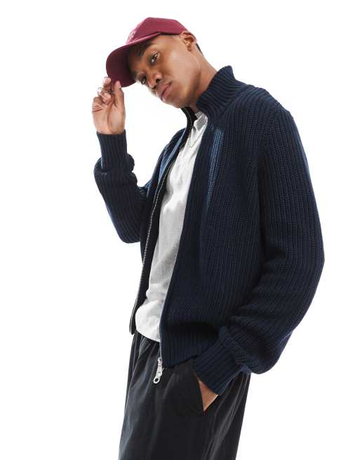 Farah - Crestone - Marineblå strikket trøje med gennemgående lynlås