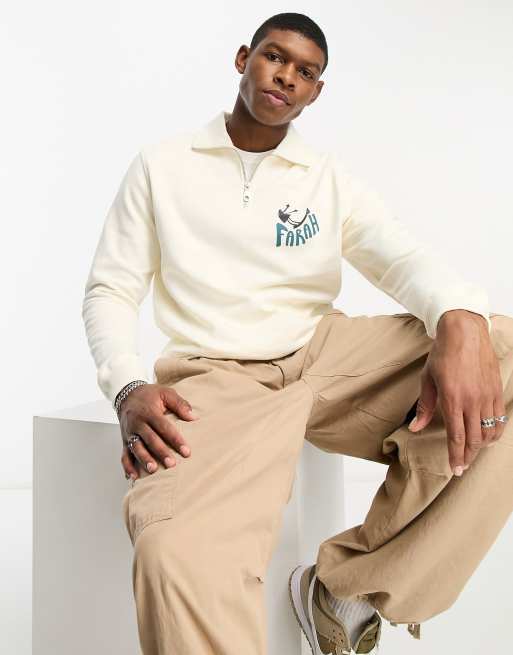 Farah - Hoffman - Råhvid sweatshirt med 1/4 lynlås og print på ryggen