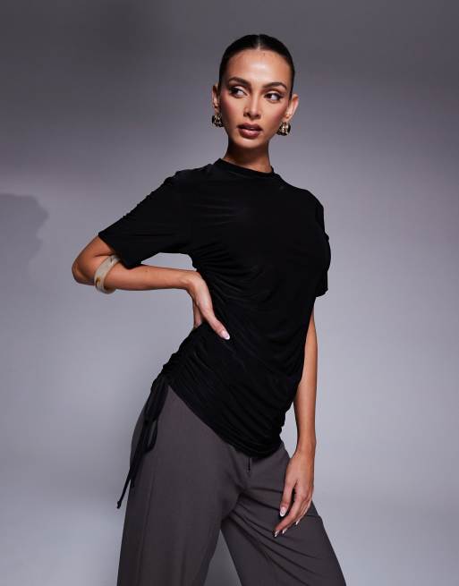 Fashionkilla - Sort, stram og dobbeltformgivende T-shirt med asymmetrisk snit og rynker i siden