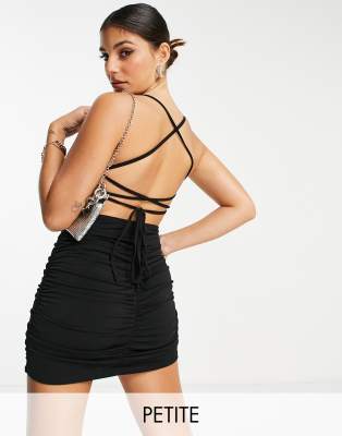 Flounce London Petite - Sort stram minikjole med vandfaldsudskæring