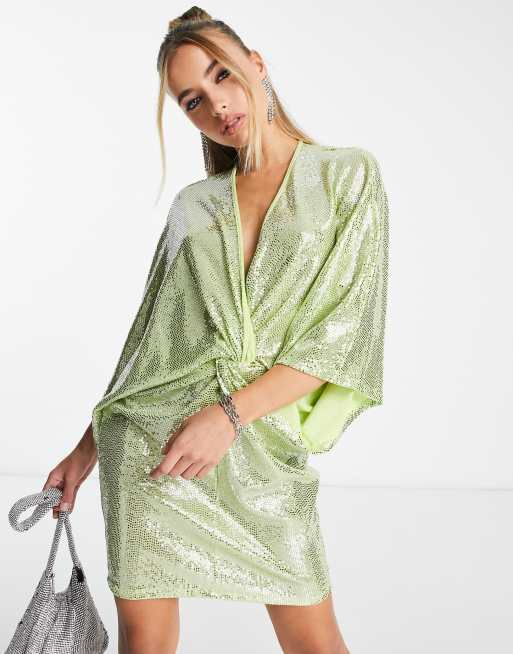 Flounce London - Limegrøn minikjole med plunge front og hængeærmer