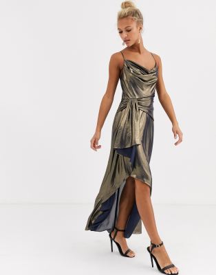 Forever New - Metalfarvet midikjole med vandfaldsudskæring i guld