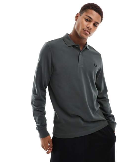Fred Perry - Ensfarvet mørkegrøn poloskjorte med lange ærmer