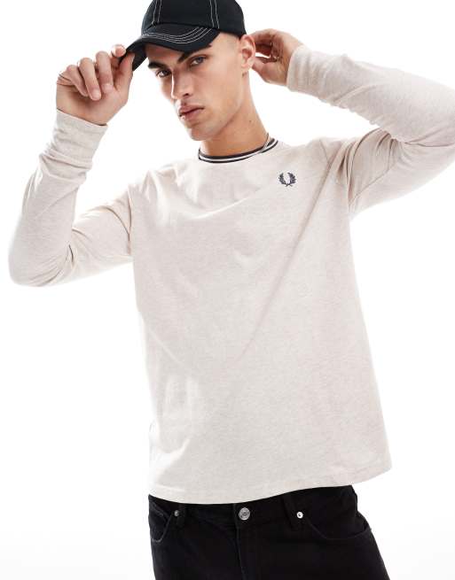 Fred Perry - Meleret beige T-shirt med lange ærmer og dobbelt striber i kanten