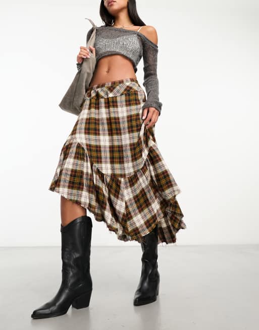 Free People - Brun asymmetrisk midinederdel med tern