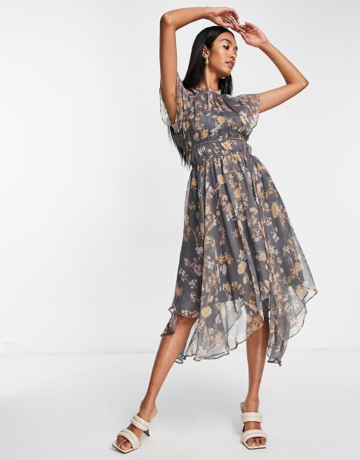 French Connection - Mørk og kortærmet midikjole med blomstermønster