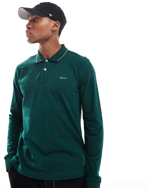 GANT - Mørkegrøn polo med lange ærmer, logo og farvekanter i regular fit