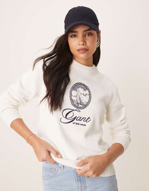 GANT - Råhvid trøje med rund hals og centreret broderet logo