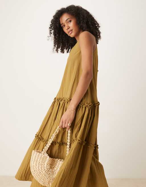 Ghospell - Olivengrøn lagdelt midaxi-kjole med flæser