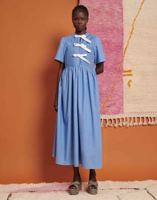 Ghospell - Skjorte-midikjole med sløjfedetalje og striber i blå