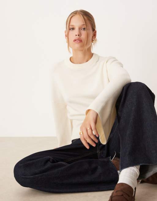 Gina Tricot - Elfenbenshvid strikket trøje med rund hals og brede ærmer