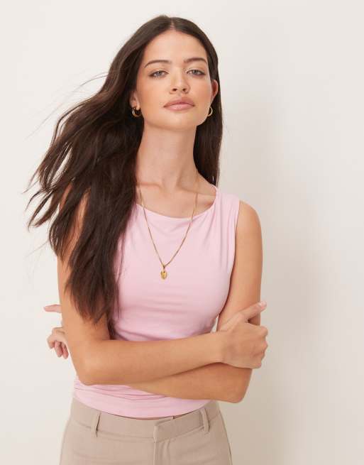 Gina Tricot - Lyserød top i blød jersey med draperinger og bådudskæring samt rynkedetalje i siden