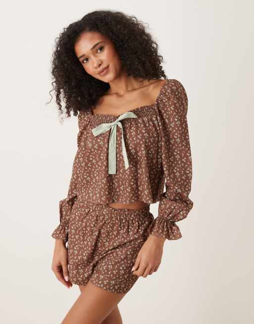 Glamorous - Brunt pyjamassæt med småblomstret print
