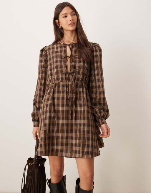 Glamorous - Langærmet smock-minikjole med bindebånd foran og lyserødt/brunt tern