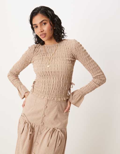Glamorous - Langærmet top med bindebånd i siderne, rynker og lysebrune tern - Del af sæt