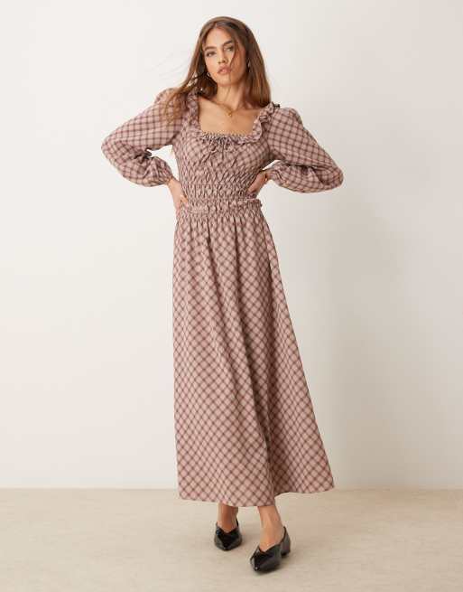 Glamorous - Rød maxikjole med smocksyninger, voluminøse ærmer og firkantet hals med bindebånd fortil