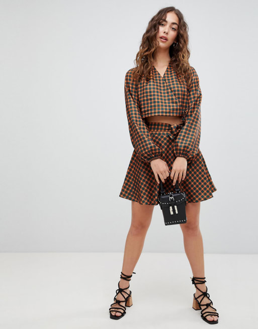Glamorous slå-om top og slå-om mini-nederdel i tern - Del af sæt