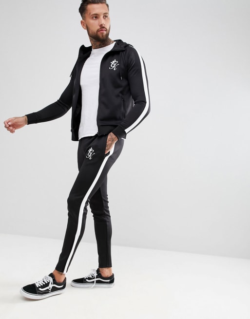 Tætsiddende joggingsæt i sort poly med sidestriber fra Gym King