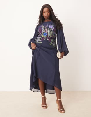 Hope & Ivy Plus - Marineblå midikjole med høj hals, blouson-ærmer og udsmykning