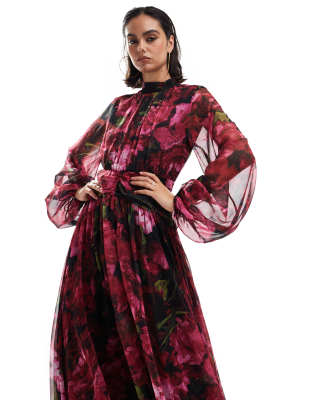 Hope & Ivy - Højhalset maxikjole i chiffon med rødt blomsterprint på mørk base