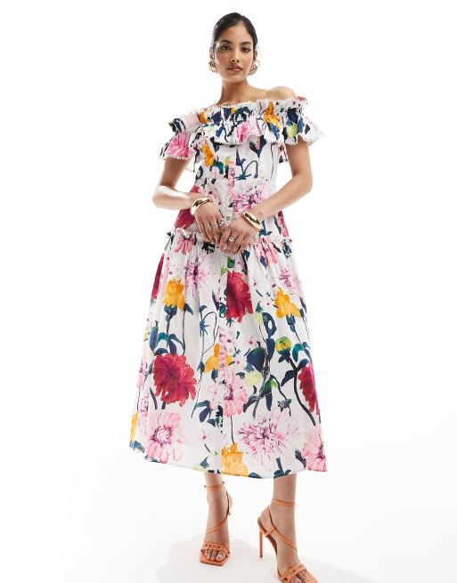 Hope & Ivy - Offshoulder-maxikjole med rynkede detaljer og farverigt blomstermønster