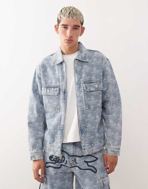 ICECREAM - Lyseblå trucker-denimjakke med gennemgående print med løbende hunde - Del af sæt