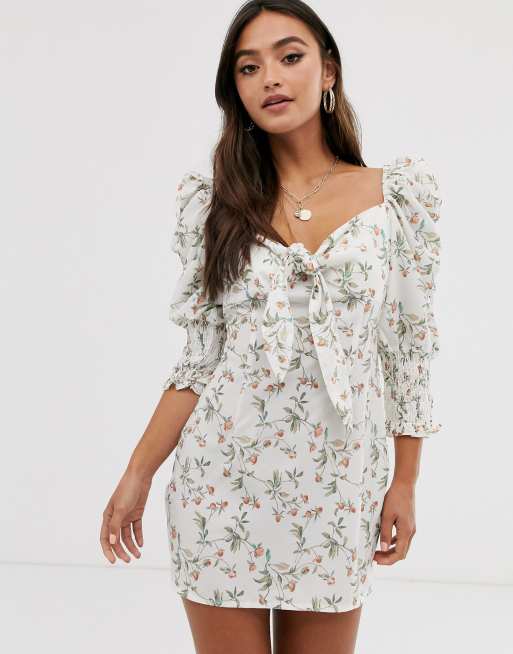 Hvid minikjole med blomsterprint, bindebånd foran og puffede skuldre fra In The Style x Laura Jade