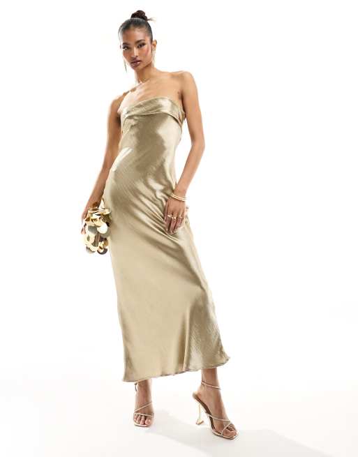 In The Style - Guldfarvet bandeau-midikjole i flydende satin med udskæring på ryggen