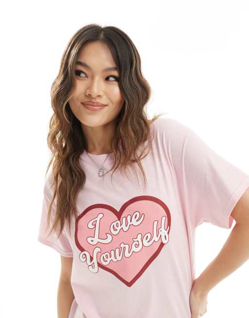 In The Style - Lyserød T-shirt med hjerteprint med 'Love Yourself'-tekst