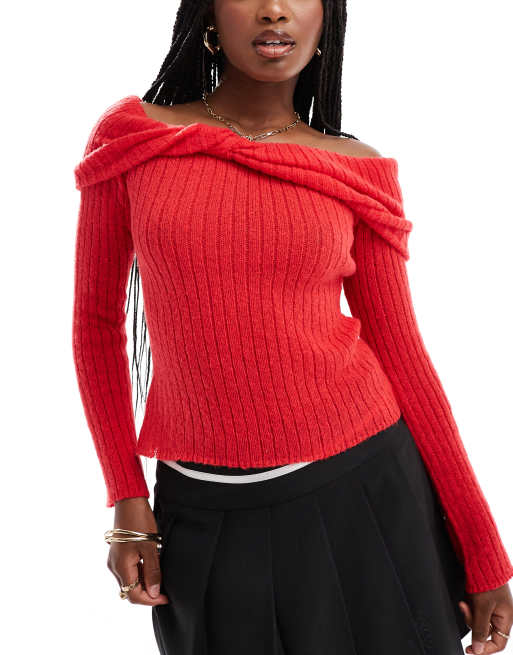 In The Style - Rød strikkjole med bardotsnit og snoning