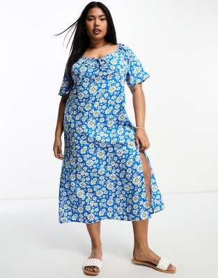 Influence Plus - Blå midikjole med bindefront og marguerit-print