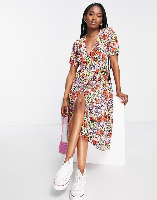 Influence - Midikjole med slå-om-detalje i markant blomstermønster