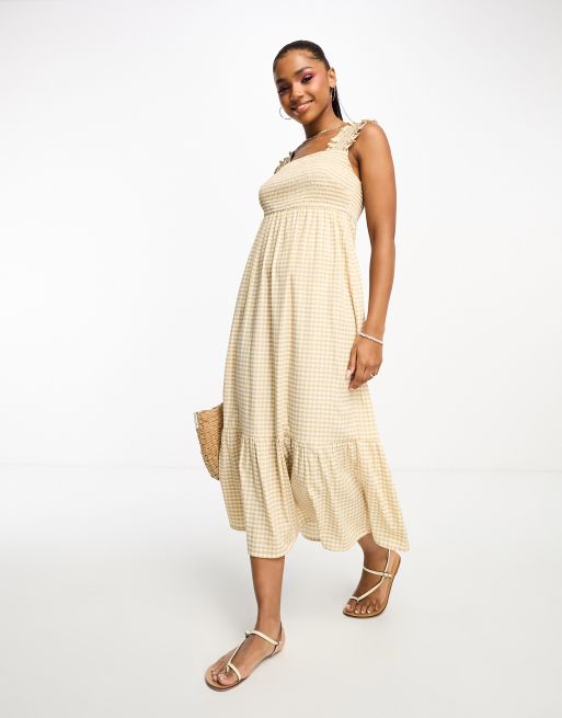 Influence - Midikjole med tekstur og flæsestropper i beige gingham-tern