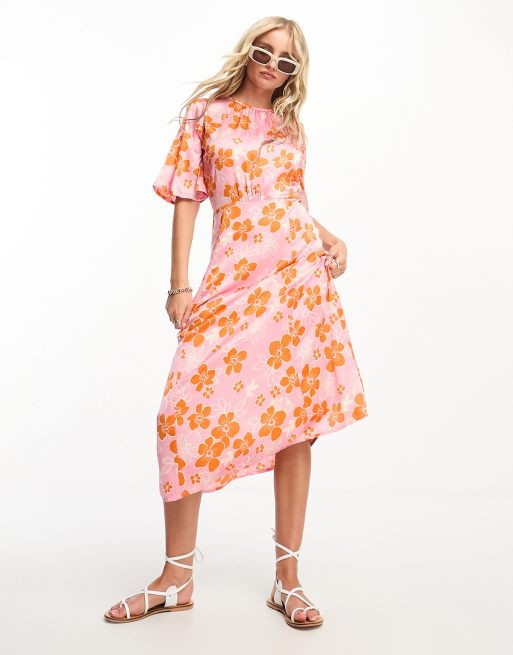 Influence - Orange tea-midikjole i satin med blomstermønster