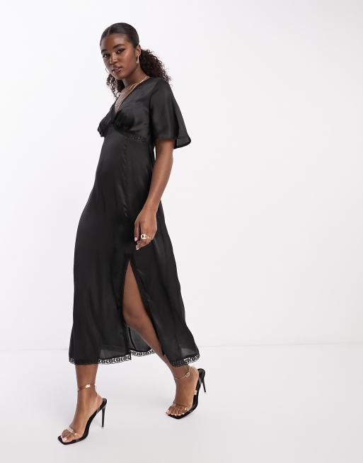Influence - Sort midikjole med flagrende ærmer, V-hals og blondekant
