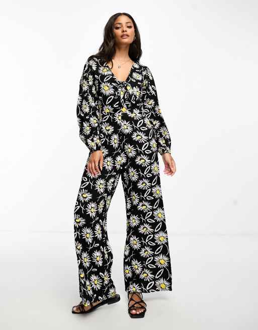 Influence - Sort og hvid jumpsuit med frontbinding pufærmer og tusindfrydprint
