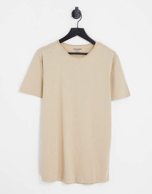 Jack & Jones Essentials - Beige longline T-shirt med rå kanter og dyb rund hals
