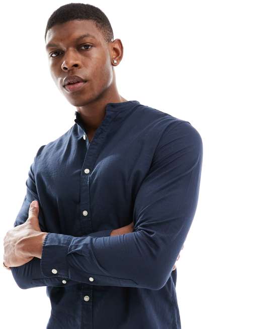 Jack & Jones - Marineblå skjorte med grandad-krave i hørblanding