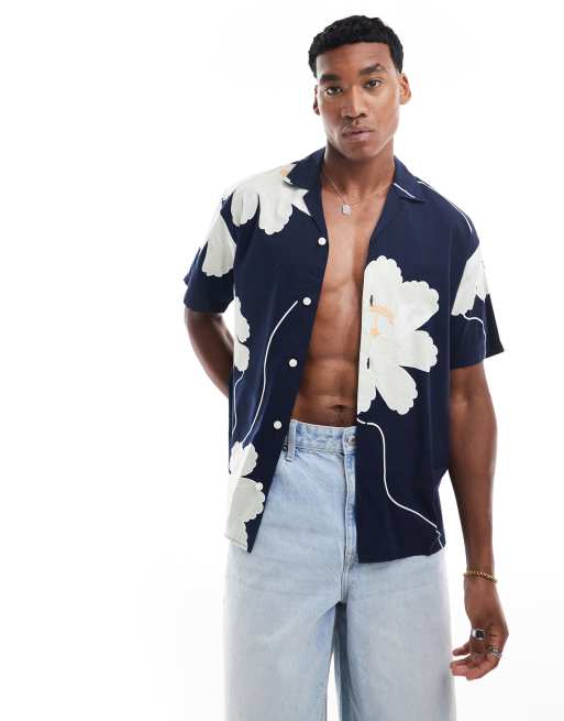 Jack & Jones - Marineblå skjorte med reverskrave og blomsterprint