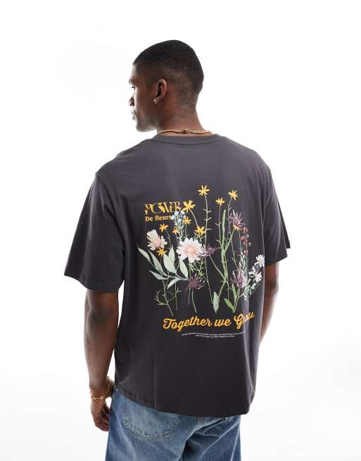 Jack & Jones - Mørkegrå oversized T-shirt med blomsterprint på ryggen