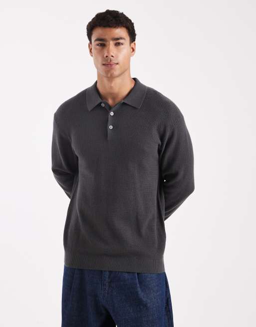 Jack & Jones - Premium - Mørkegrå strikket polo med lange ærmer
