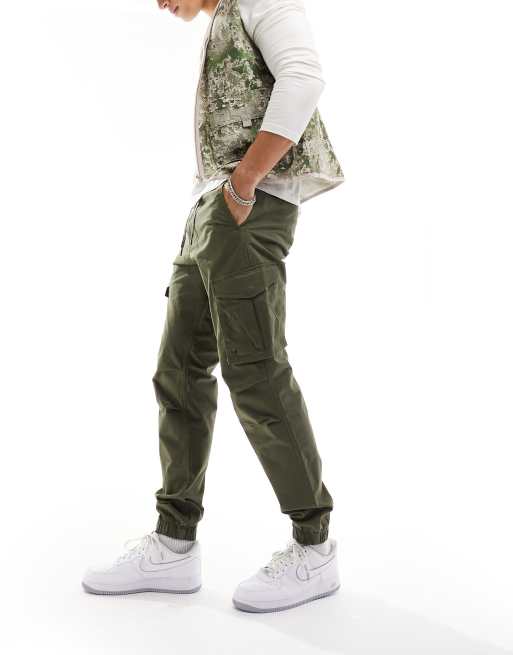 Jack & Jones - Tapered mørkegrønne cargobukser med tætsiddende kanter