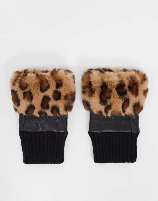 Jayley - Fingerløse handsker med imiteret pelsbeklædning i sort med leopard