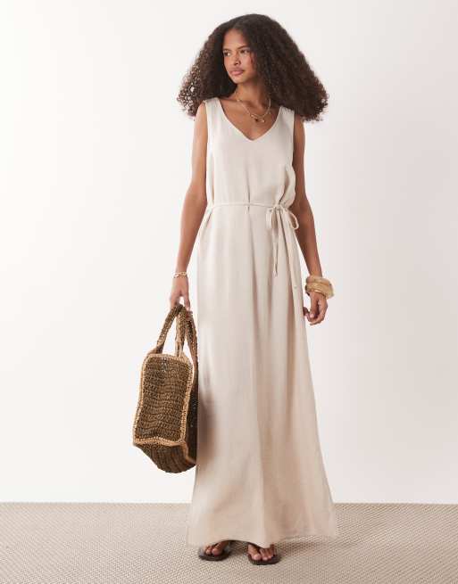 JDY - Havrefarvet maxikjole med bindebånd i taljen i hørblanding