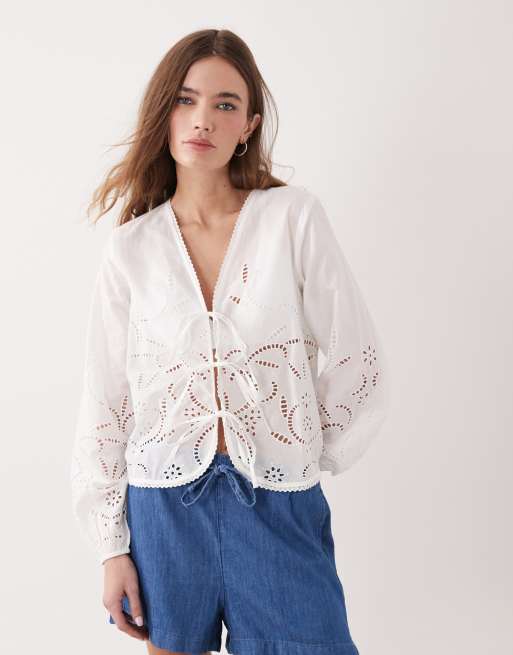 JDY - Hvid top med hæklede detaljer samt blondekant og bindebånd foran