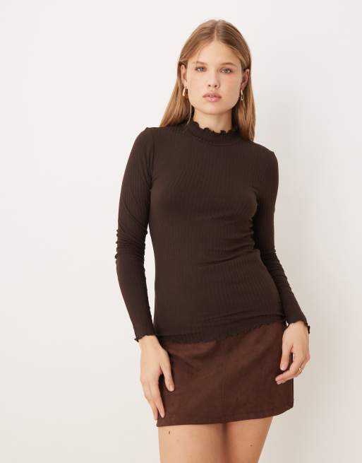 JDY - Mørkebrun og langærmet top med bølgekant