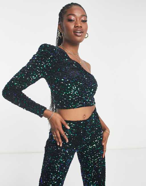 JDY - Oneshoulder-croptop med pailletter i grøn og sort - Del af sæt