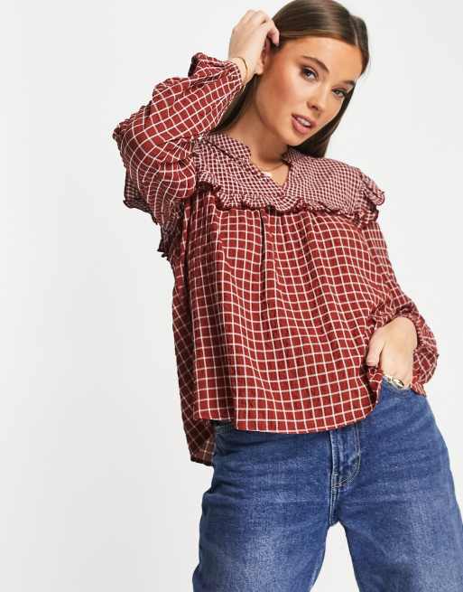 JDY - Rustrød smock-bluse med flæser og tern